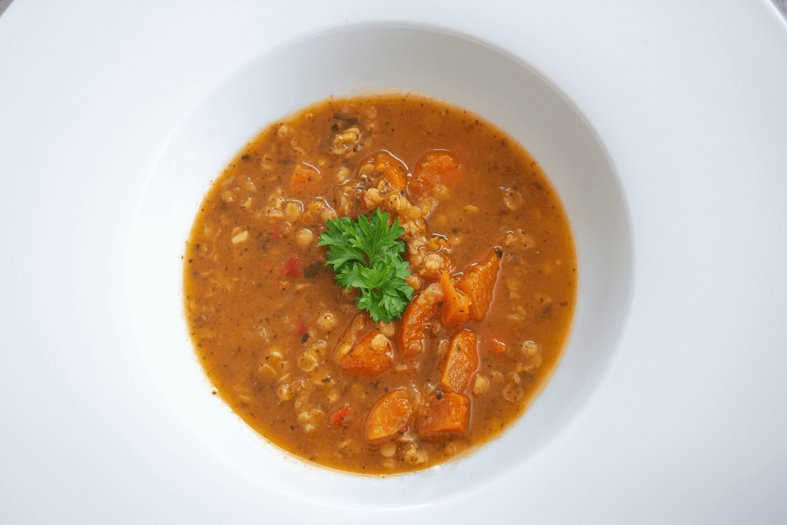 | Összetevők: | Víz, sárgarépa (25,0%), paradicsom, vörös lencse (5,2%), hagyma, homoktövislé (2,7%), chili, repceolaj, szárított tengeri alga (0,6%), só, fűszerek |